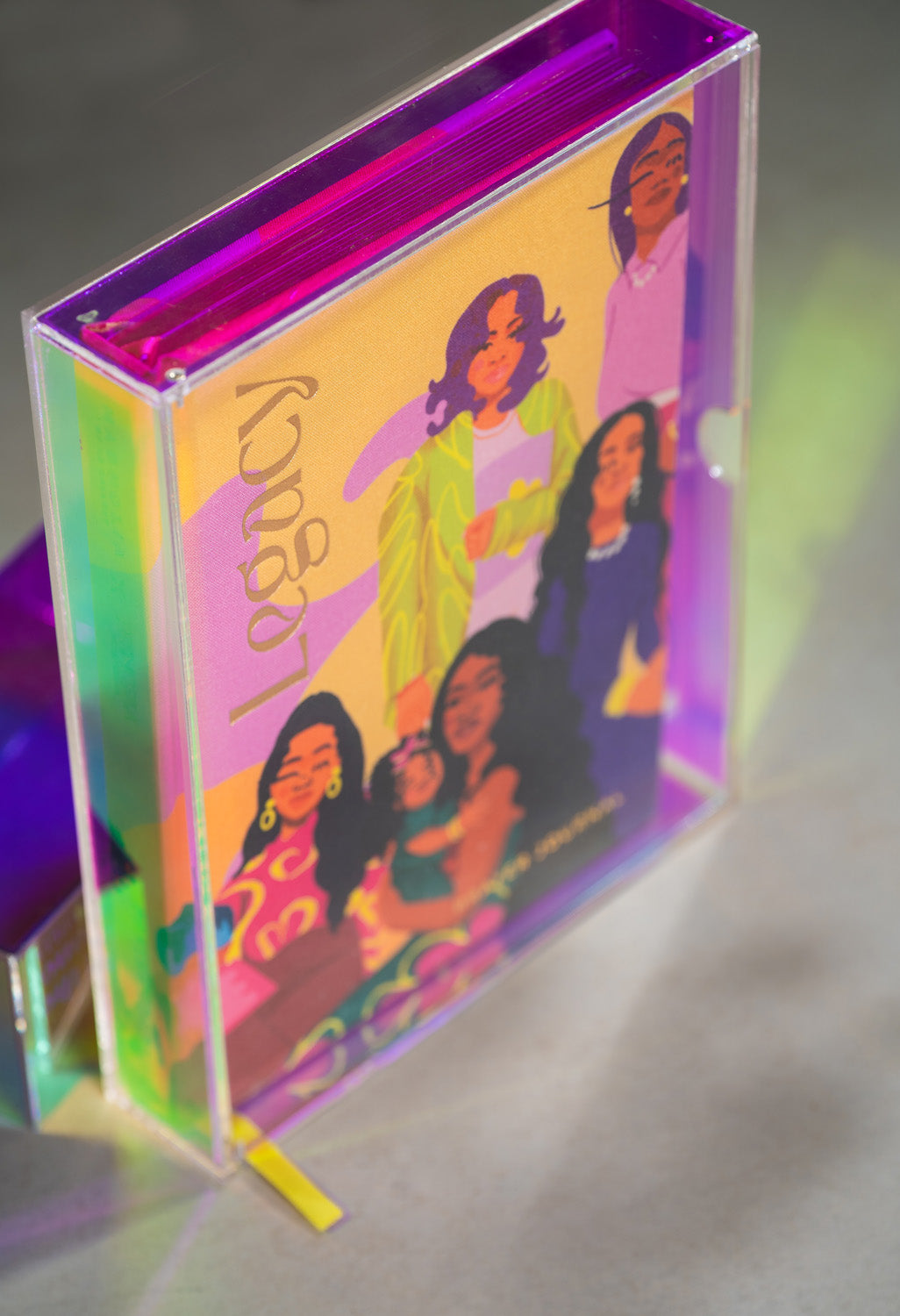 Iridescent acrylic box with a clear lid.